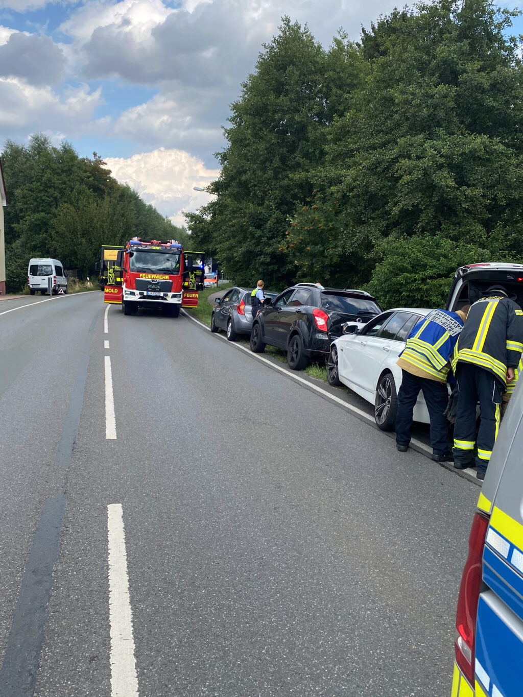 Heute Nachmittag, gegen 16:00 Uhr, erhielt die Feuerwehr- und Rettungsleitstelle Lippe Informationen über einen Verkehrsunfall auf der Bielefelder Straße im Stadtteil Pivitsheide. Ein automatischer Notruf wurde von einem der an der Kollision beteiligten Fahrzeuge abgesetzt, der auf eine eingeklemmte Person hinwies. Das hauptamtliche Personal sowie die Feuerwehr Pivitsheide und der Rettungsdienst mit einem Notarzt rückten sofort zum Unfallort aus. Bei ihrer Ankunft bestätigte die Einsatzleitung, dass entgegen den ersten Meldungen tatsächlich keine Person eingeklemmt war. Die Feuerwehrleute klemmten die Batterien der betroffenen Fahrzeuge ab und setzten Bindemittel ein, um auslaufenden Kraftstoff einzudämmen. In der Zwischenzeit leisteten der Rettungsdienst und der Notarzt medizinische Hilfe für die in den Unfall verwickelten Personen.